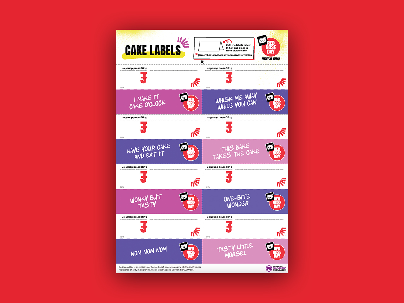 Let people know what your delicious bakes are, and how much they cost, with these Red Nose Day cake labels.